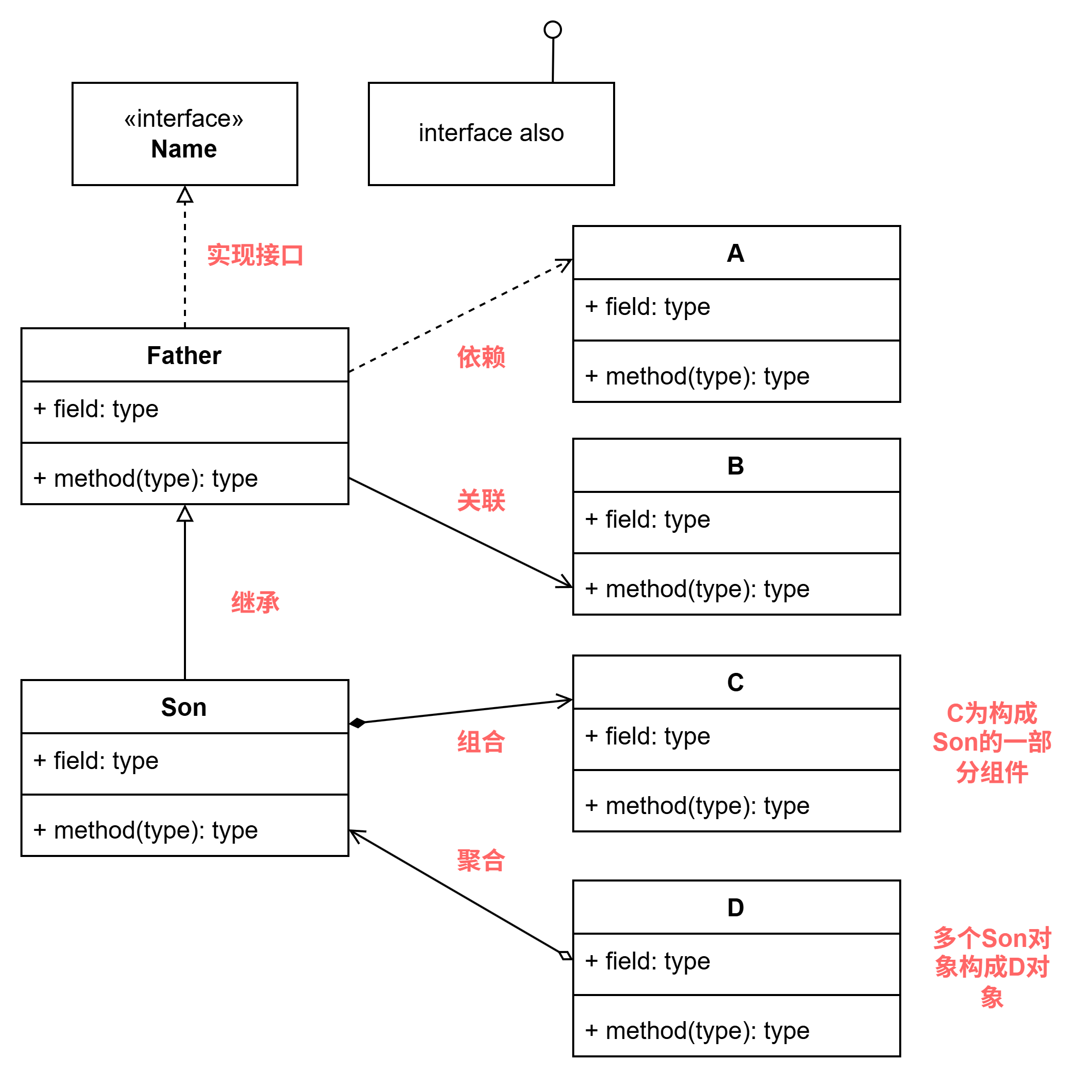 - 空心菱形 = 聚合(弱),实心菱形 = 组合(强)