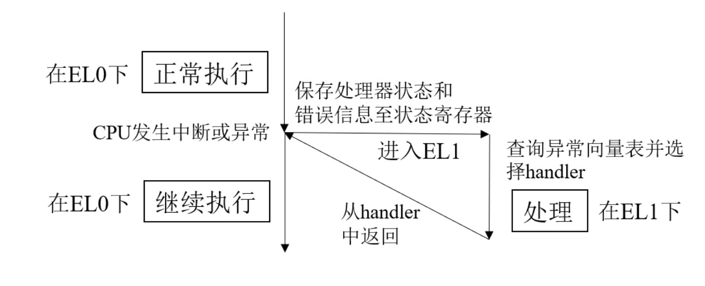 切换的时候会 先保存处理器状态与错误信息至状态寄存器,主要保存 3 个变量: 异常触发的指令地址 PC、异常的原因、当前 CPU 的栈指针 SP。当发生用户态到内核态的切换时,CPU 会先获取异常向量表,然后根据异常的原因来调用相应的异常处理函数。异常处理完成后,会恢复应用储蓄的现场,恢复 PC 与 SP 指针,并切换回用户态。如下图所示,其中 EL0 指的是用户态,EL1 指的是内核态。