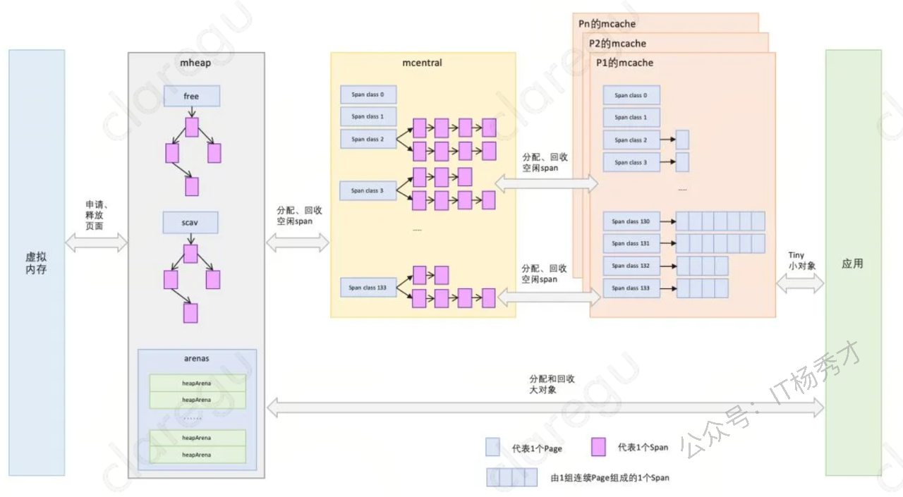 与TCMalloc中的Span相同,Span是go内存管理的基本单位,代码中为 mspan ,一组连续的Page组成1个Span,所以上图一组连续的浅蓝色长方形代表的是一组Page组成的1个Span,另外,1个淡紫色长方形为1个Span。