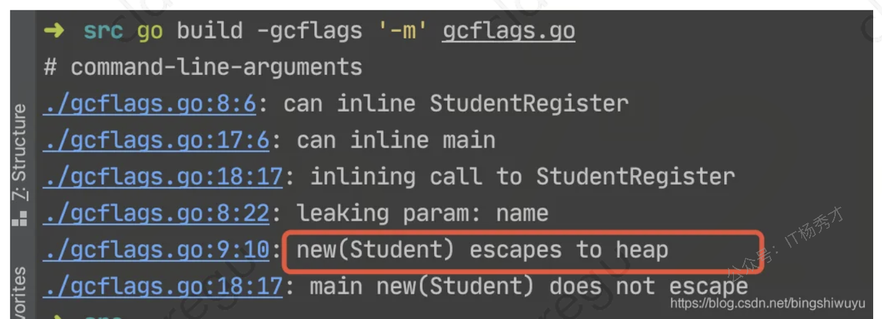 ”escapes to heap”,代表该行内存分配发生了逃逸现象。